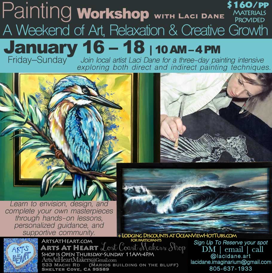 Friday + Saturday + Sunday ~ January 16th-18th, 2026 ~ Painting Workshop with Laci Dane 10AM-4PM ~ $160/pp ~ A Weekend of Art, Relaxation and Creative Growth ~ Join local artist Laci Dane for a three-day painting intensive exploring both direct and indirect painting techniques. Learn to envision, design, and complete your own masterpieces through hands-on lessons, personalized guidance, and supportive community. By the end of the weekend, you’ll take home three finished paintings—plus new skills, confidence, and inspiration to continue creating on your own.