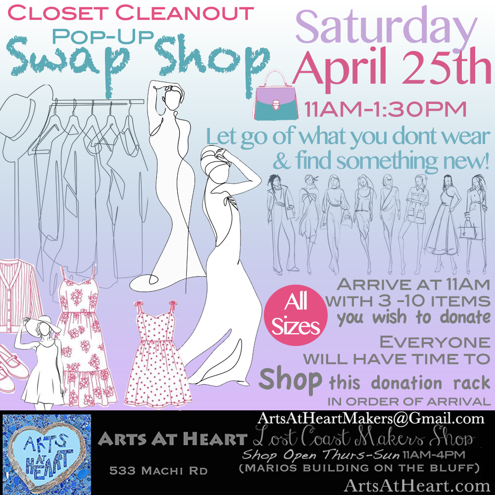Saturday April 25th 11AM -1:30PM ~ Closet Clean Out – pop-up – Swap Shop – Let go of what you don’t wear & find something new! Arrive at 11AM with 3 -10 items you wish to donate ~ Everyone will have time to Shop this donation rack in order of arrival. Open to everyone ~ All sizes welcome!