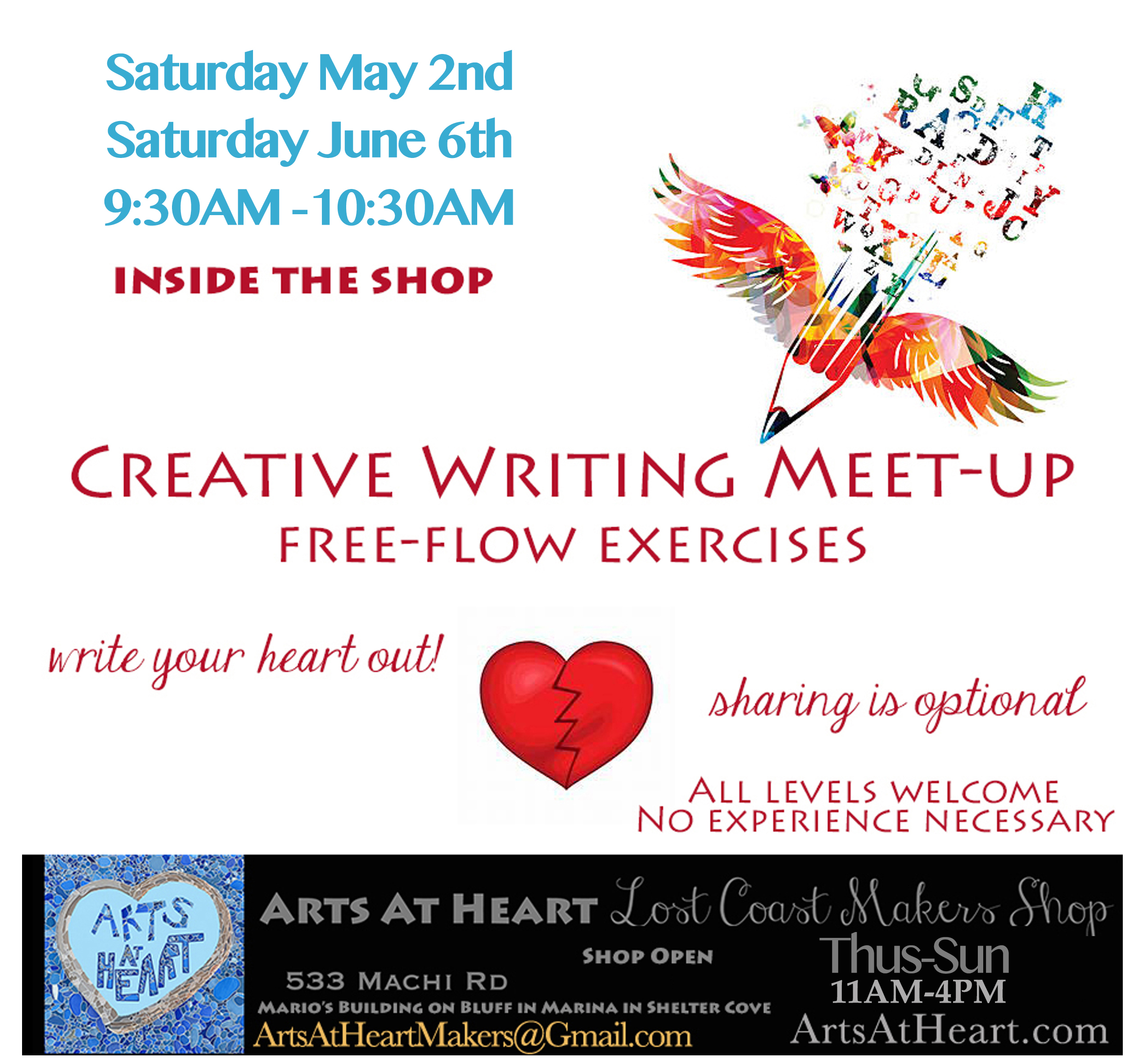 Saturday May 2nd 9:30AM -10:30AM ~ Creative Writing Meet-up with Amy Lundstrom ~ Come with a notepad an writing instrument of choice for relaxing, spontaneous writing exercises to invite your creativity out. Sharing is optional and no experience necessary. Free